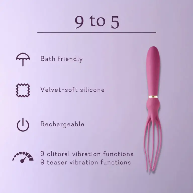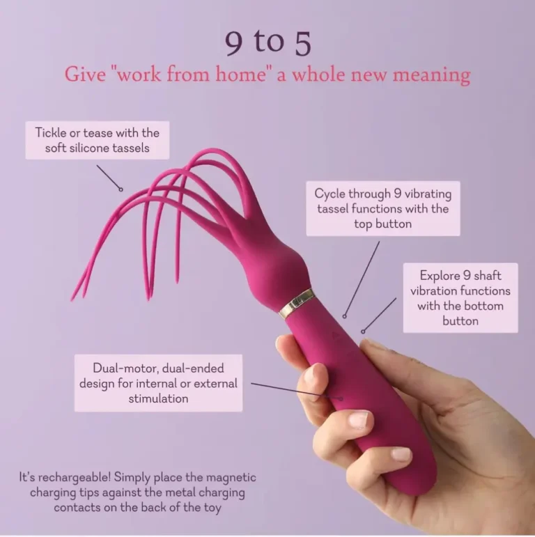 Clock in for pleasure. The 9 to 5 Massager brings dual motors, dual ends, and double the delight. One side offers a massaging shaft perfect for deep stimulation, while the other features silky silicone tassels that tease and tickle every erogenous zone. Great for solo relaxation or partner play—because who says you can’t mix business with pleasure?