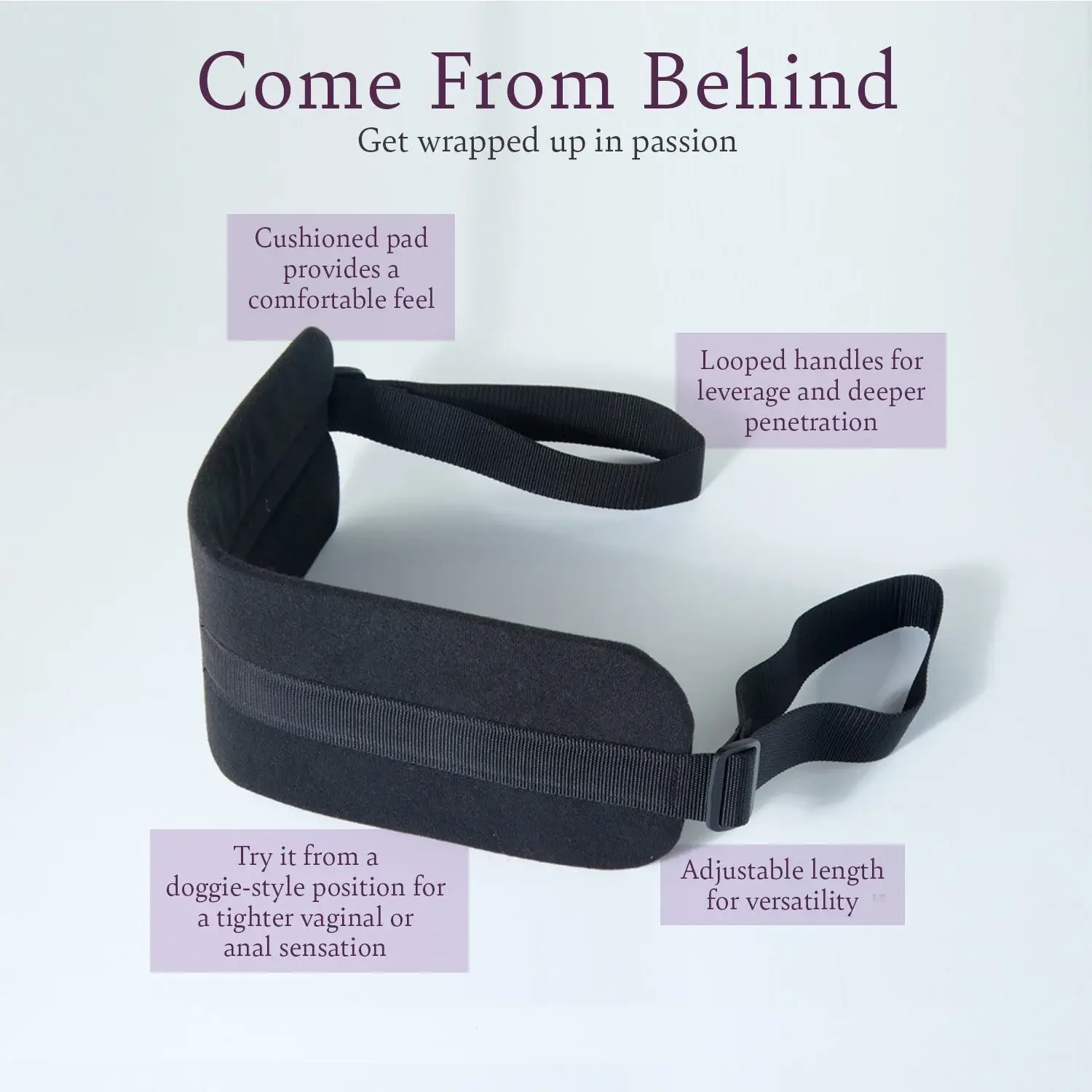 Remix a classic. Come From Behind adds comfort, control, and deeper angles to doggy (and more). A cushioned pad hugs the receiving partner’s waist while looped handles give the giving partner leverage for better penetration—and better orgasms.