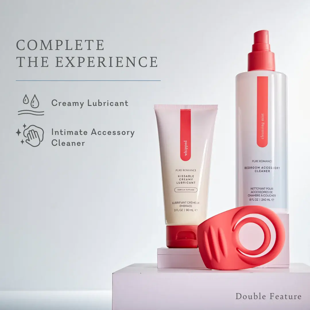 When one incredible performance just isn’t enough, you need a Double Feature! Flexible twin rings offer satisfying sensations for your partner while a powerful 10-function clitoral vibrator delivers intense pleasure for you. Slip one silicone ring over the penis and the other over the testicles, then turn the ridged massager toward your clitoris for a mind-blowing show that’s just getting started! Use with Whipped creamy lubricant for maximum comfort, and Come Clean to keep your toy disinfected and protected.