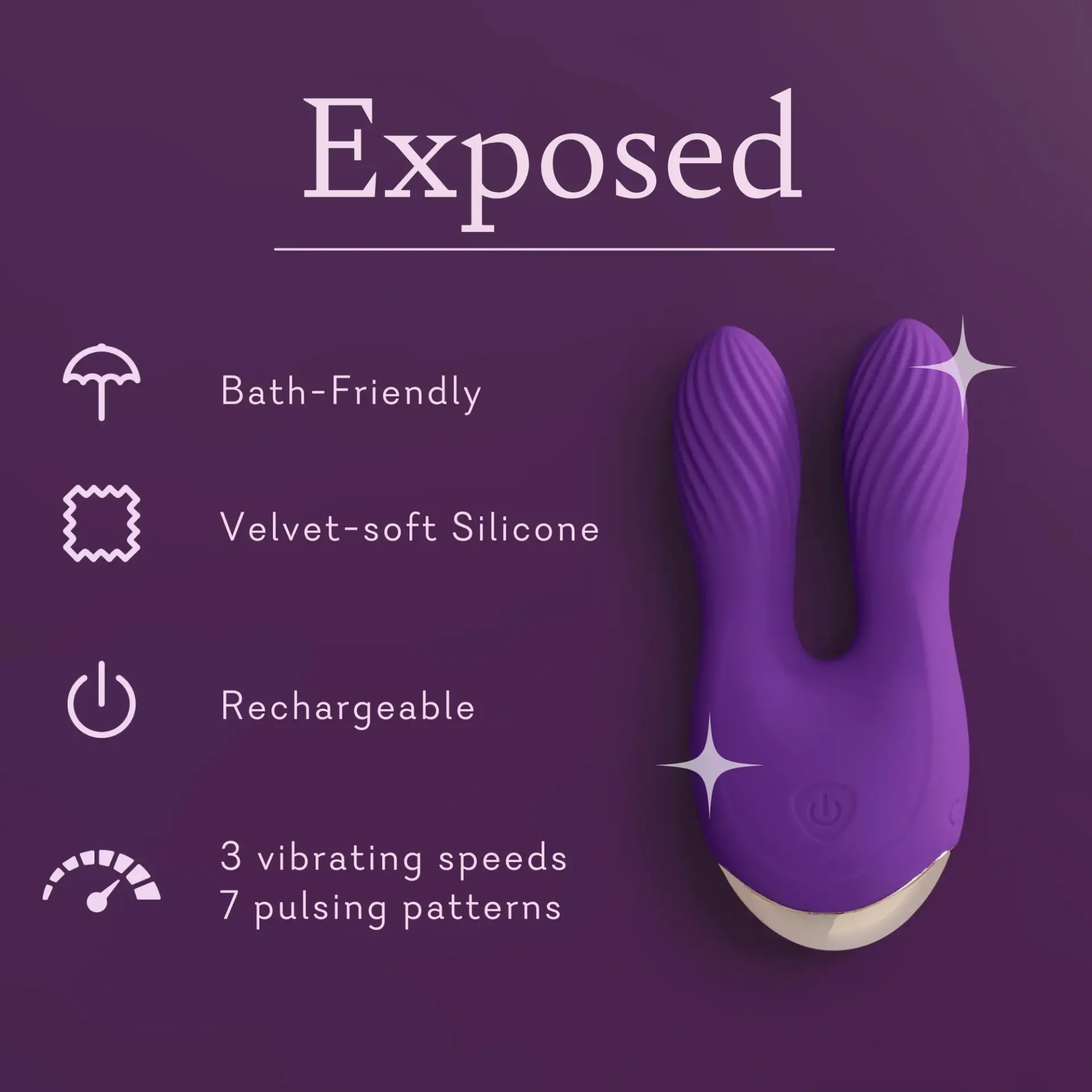 Exposed is a sleek, bendable clitoral vibrator that bends up to 40° so you can find just the right position. Dual motors in each end deliver power exactly where you want it—together or separately. Adjust the angle, explore the 3 speeds and 7 pulsing patterns, and let your fantasies unfold.