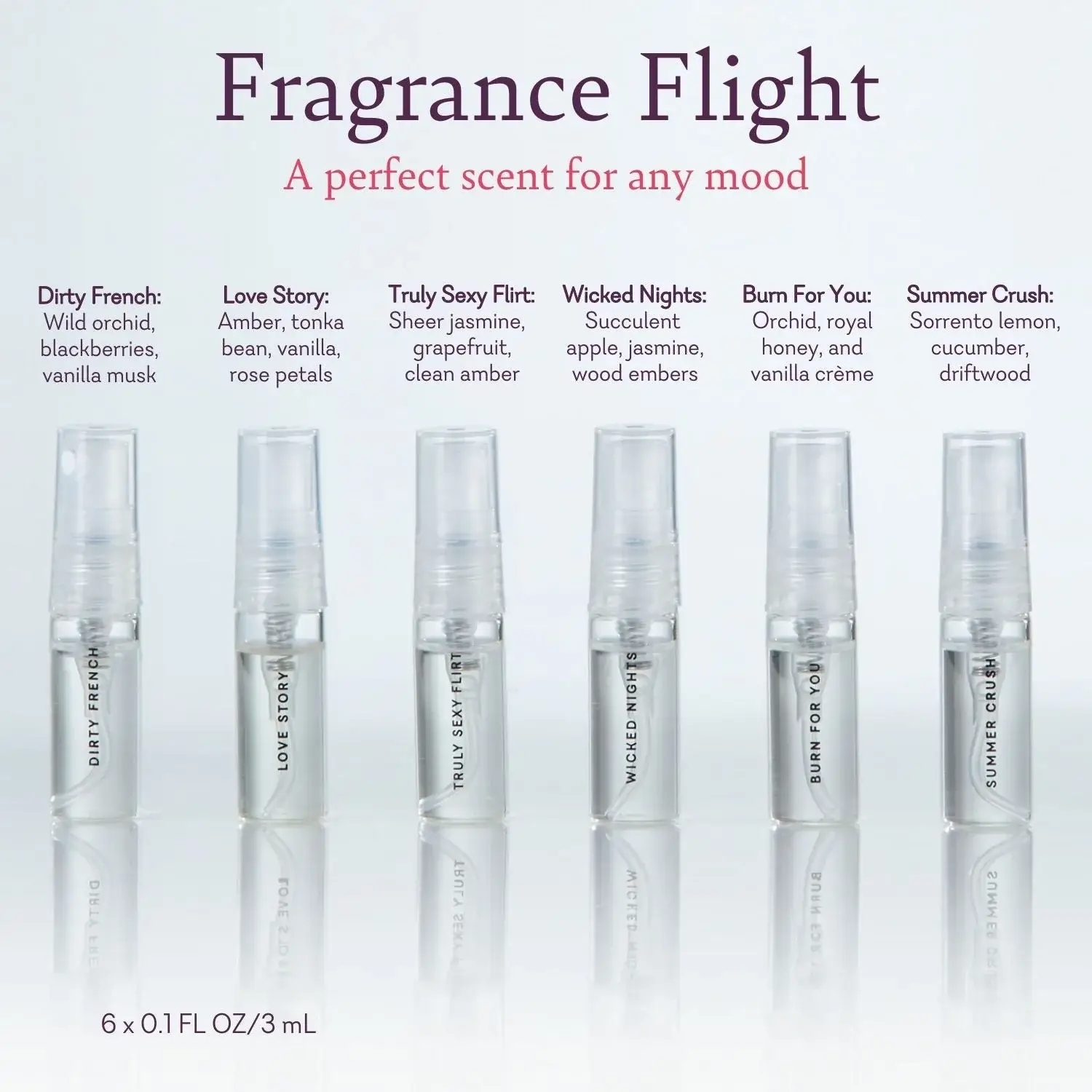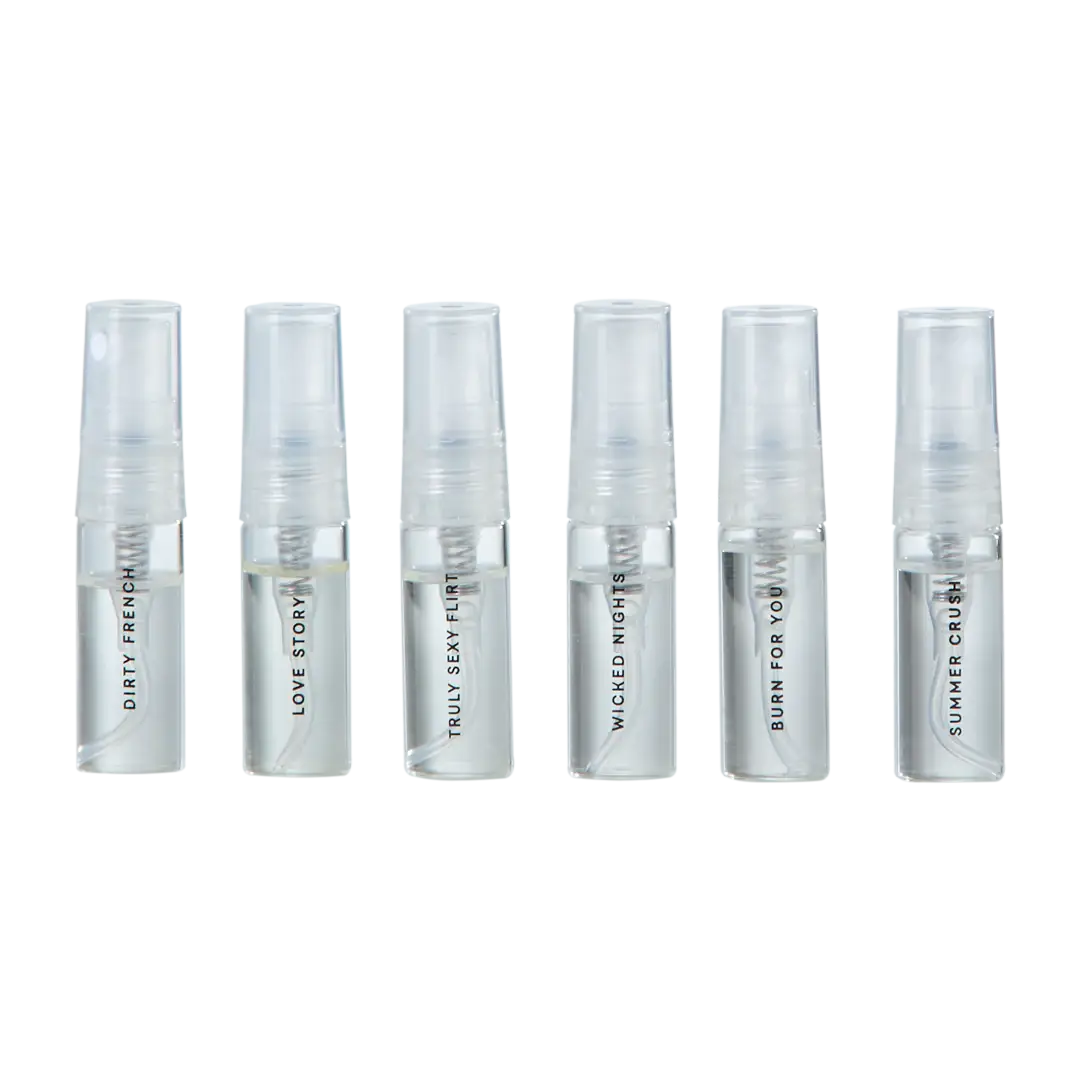 Take your senses on a journey with Fragrance Flight, a curated collection of six irresistible scents—including three new favorites: Wicked Nights, Summer Crush, and Burn For You, alongside iconic classics Dirty French, Truly Sexy Flirt, and Love Story.