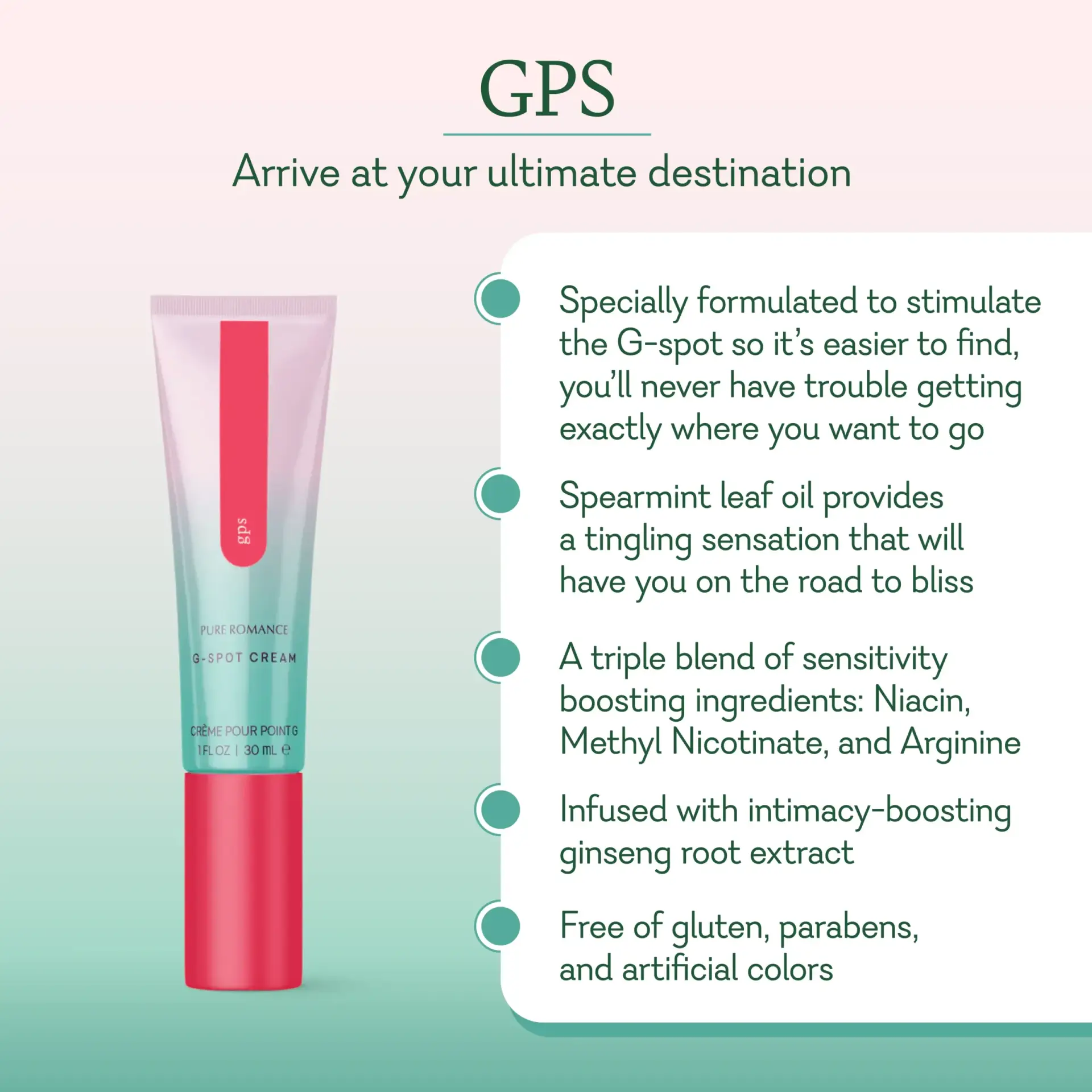 GPS G-Spot Cream heightens sensitivity to make your G-spot easier to locate and more responsive to stimulation. Infused with ginseng root, spearmint oil, and a triple blend of niacin, arginine, and methyl nicotinate, it boosts blood flow and creates a gentle tingling warmth that leads you right to pleasure’s peak.
