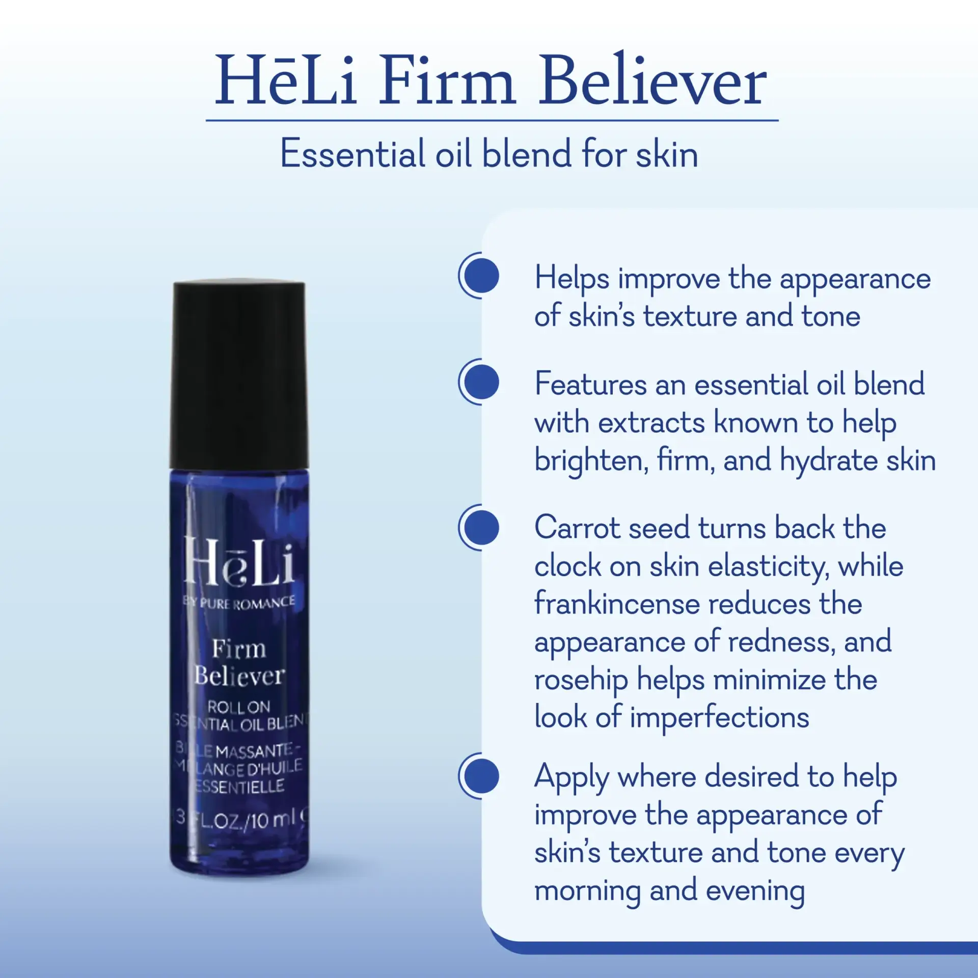 Help improve the appearance of skin’s texture and tone with Firm Believer, a rejuvenating essential oil blend with extracts known to help brighten, firm, and hydrate. Carrot seed is known to help turn back the clock on skin elasticity while frankincense helps calm inflammation and rosehip seed helps minimize skin imperfections. To use, roll this essential beauty blend on bare, clean skin every morning and evening.