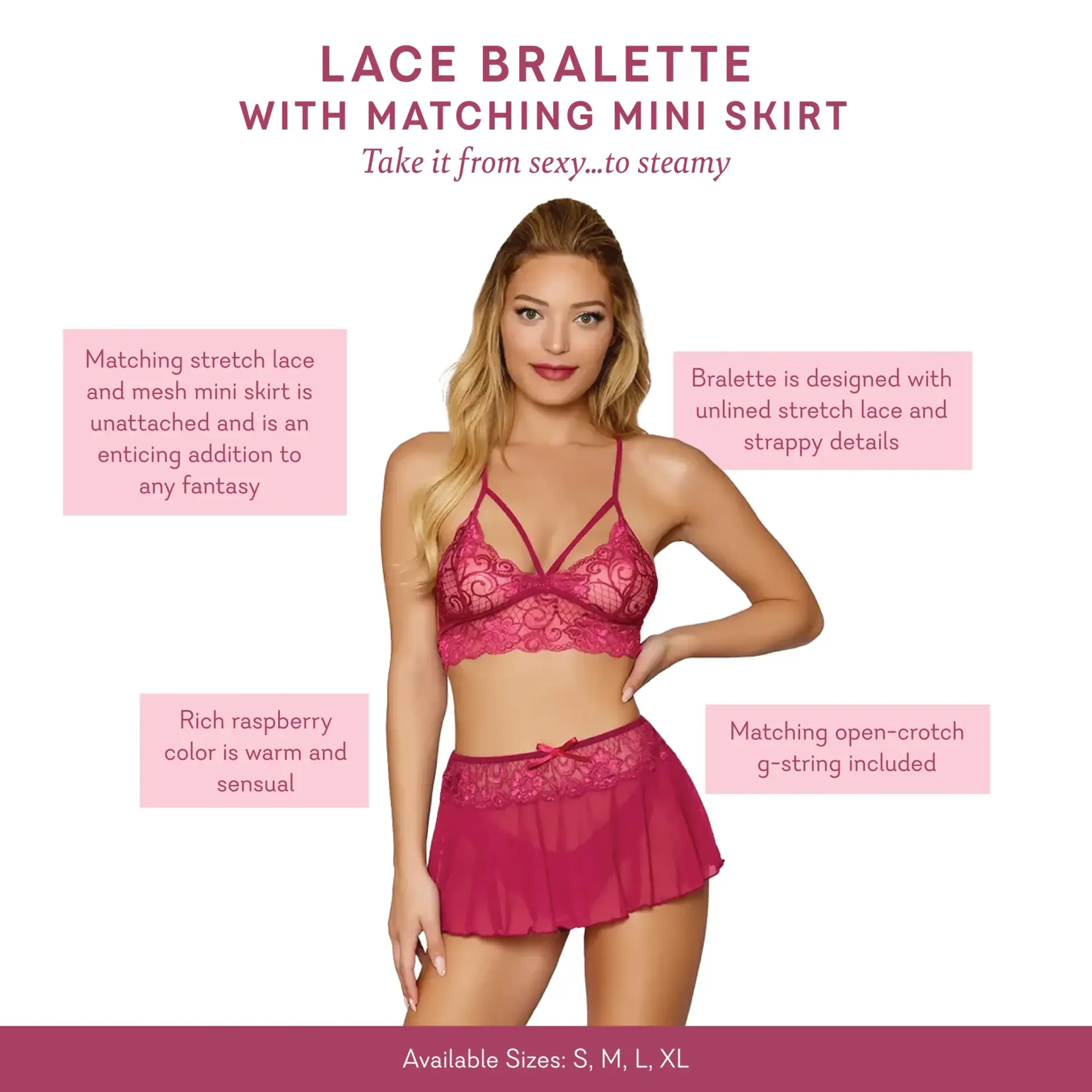 Slip into a slinky mini skirt to change your vibe from sexy to steamy. Paired with a stretch lace bralette, this unattached mini skirt is an enticing addition to any fantasy. It adds coverage and curiosity to what?s beneath, and the matching open-crotch g-string is the perfect reveal.