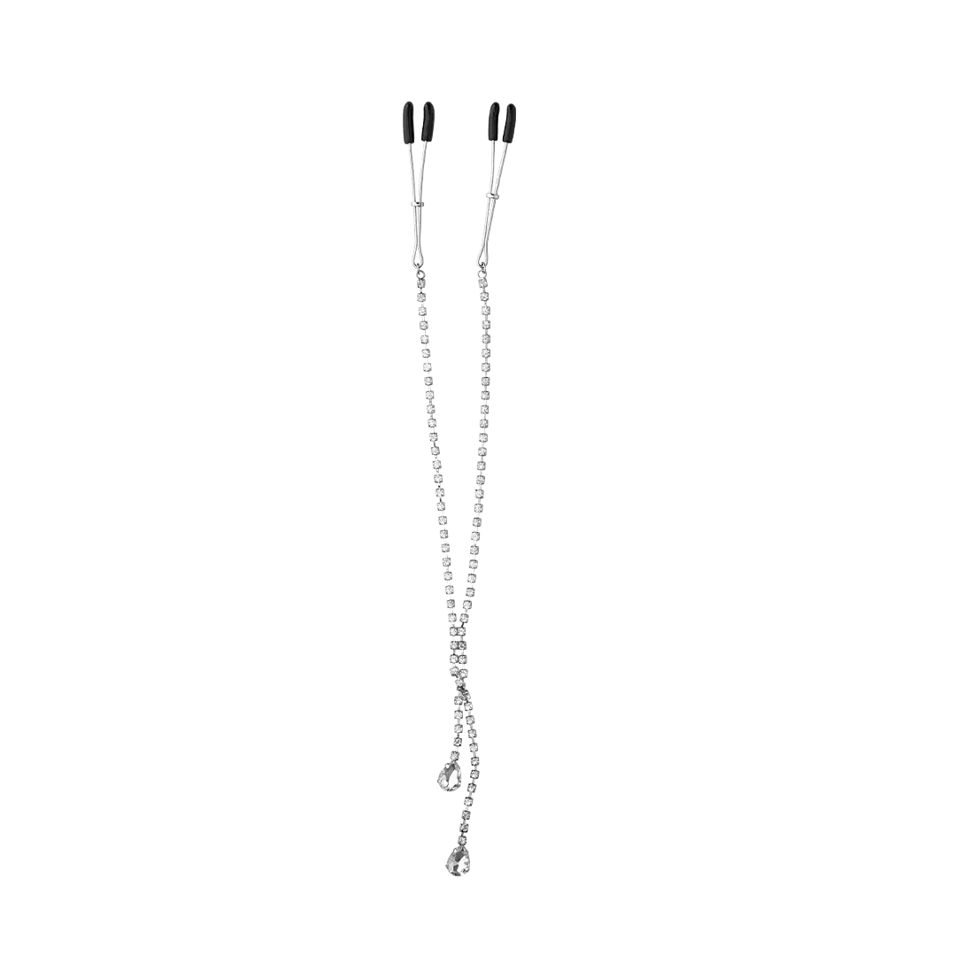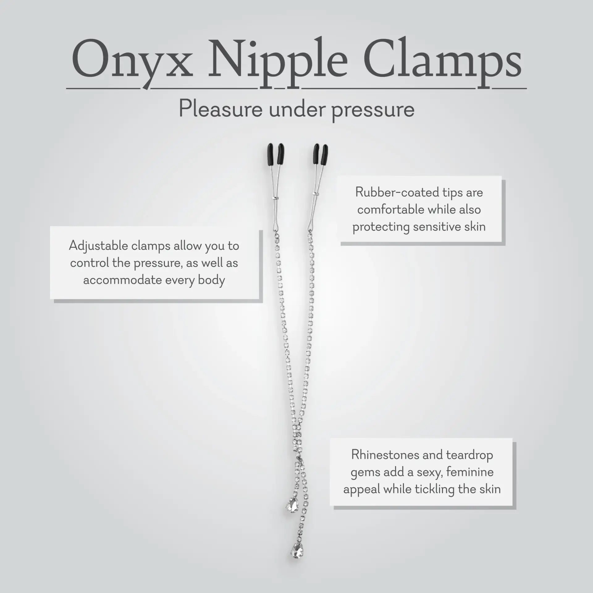 It feels good to be under pressure with the Onyx Nipple Clamps. These luxurious clamps feature rubber tips to protect skin while stimulating the nipples with sensual pressure. The Onyx Nipple Clamps are connected by a rhinestone chain and two teardrop gems that tickle the skin between bare breasts. Whether it’s for solo play or with a partner, these nipple clamps put sexy seduction within reach.