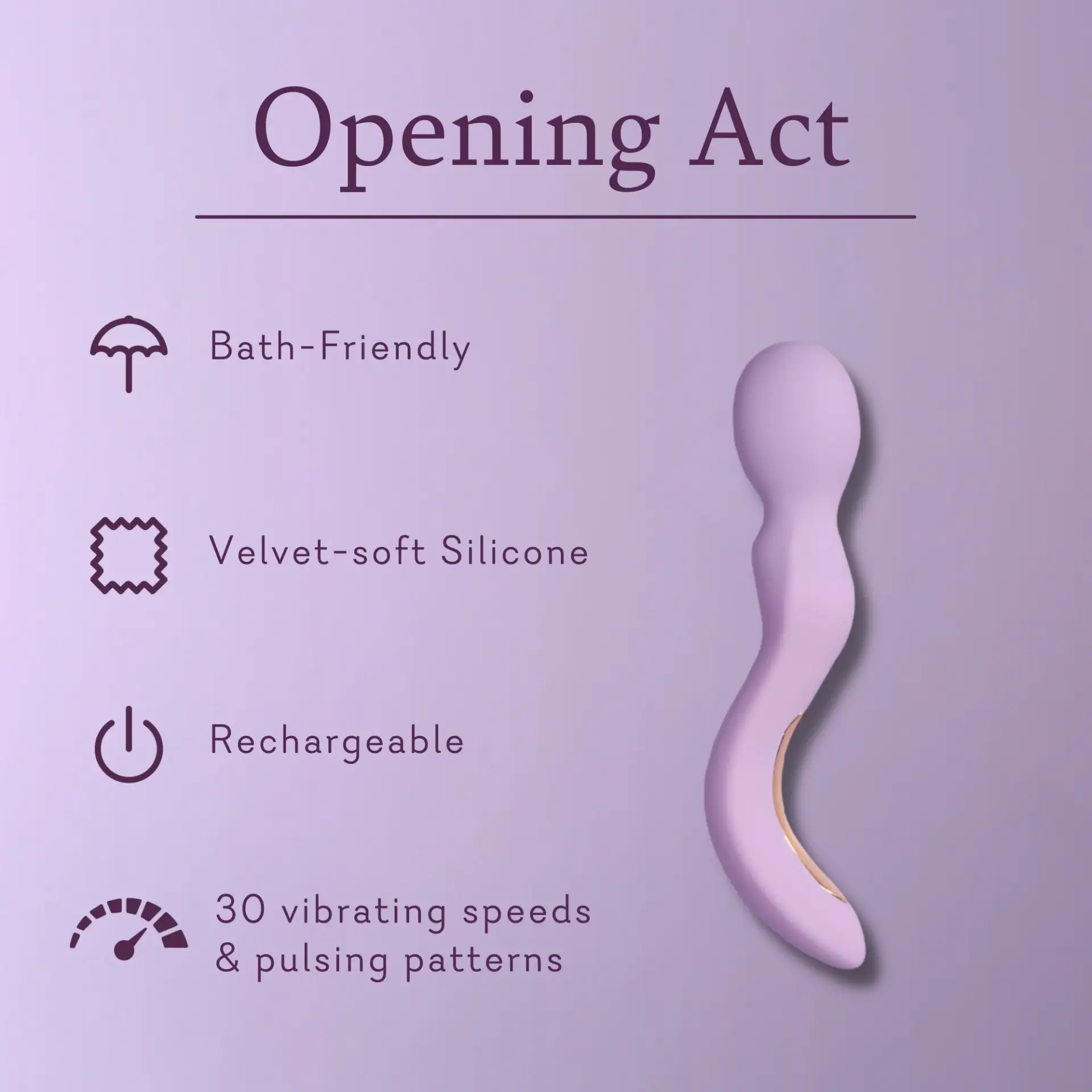 The perfect prelude to every late-night show, Opening Act pleases with 30 vibrations and pulsing patterns. Ergonomically contoured, this silicone wand vibrator is designed to tantalize the clitoris, but you can also dance it down your every curve for the best kind of full-body massage. Try it in the bedroom or the bath and play any way you wish.