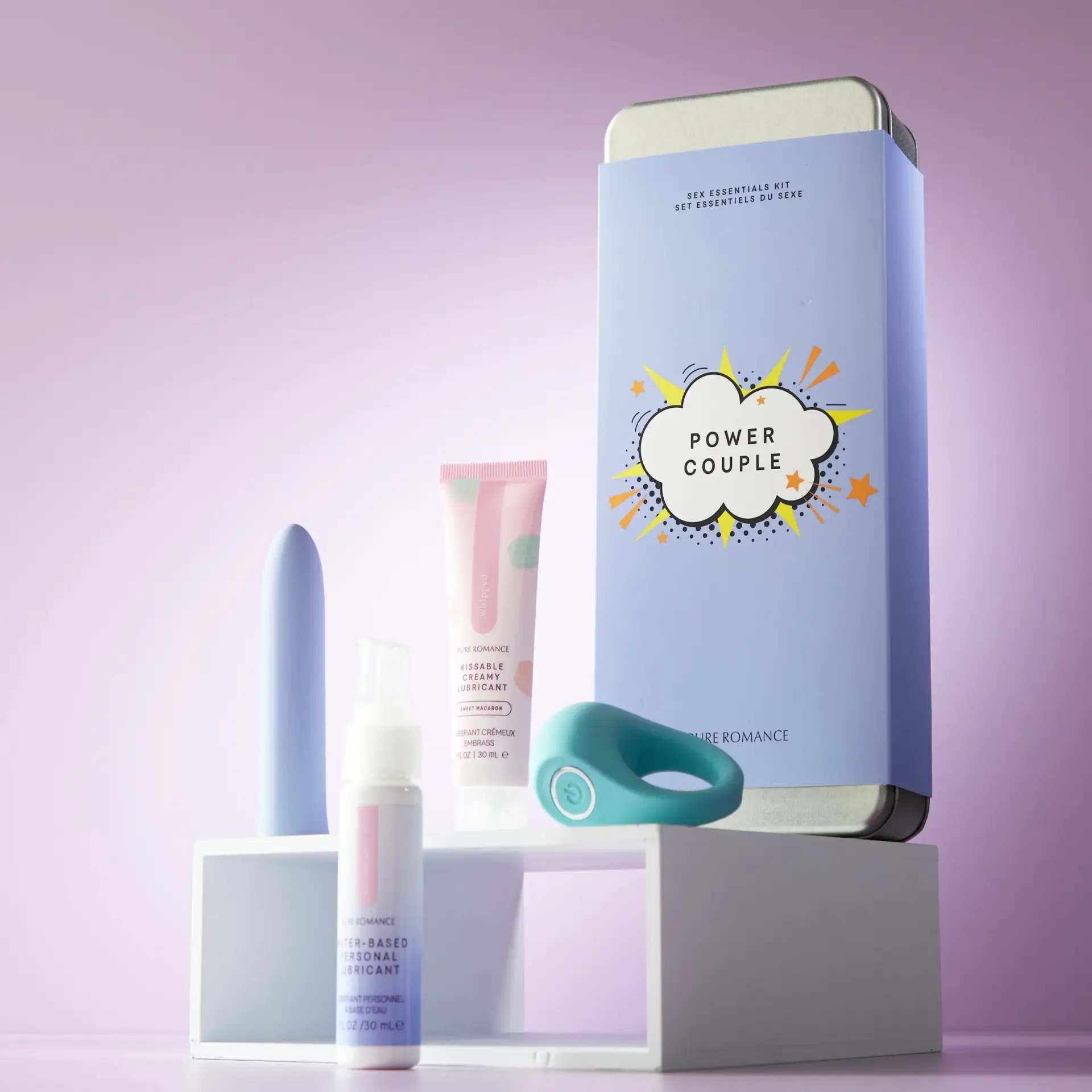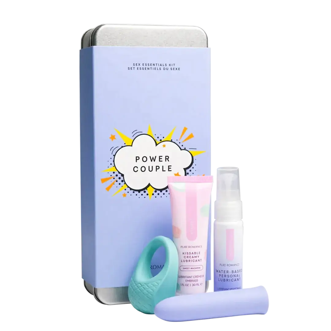 The Power Couple kit brings everything you need to play, explore, and connect. Inside, you’ll find a sleek classic vibrator, a textured c-ring for mutual pleasure, and two lubricants—Just Like Me (for silky water-based glide) and Whipped Sweet Macaron (a creamy, kissable treat).