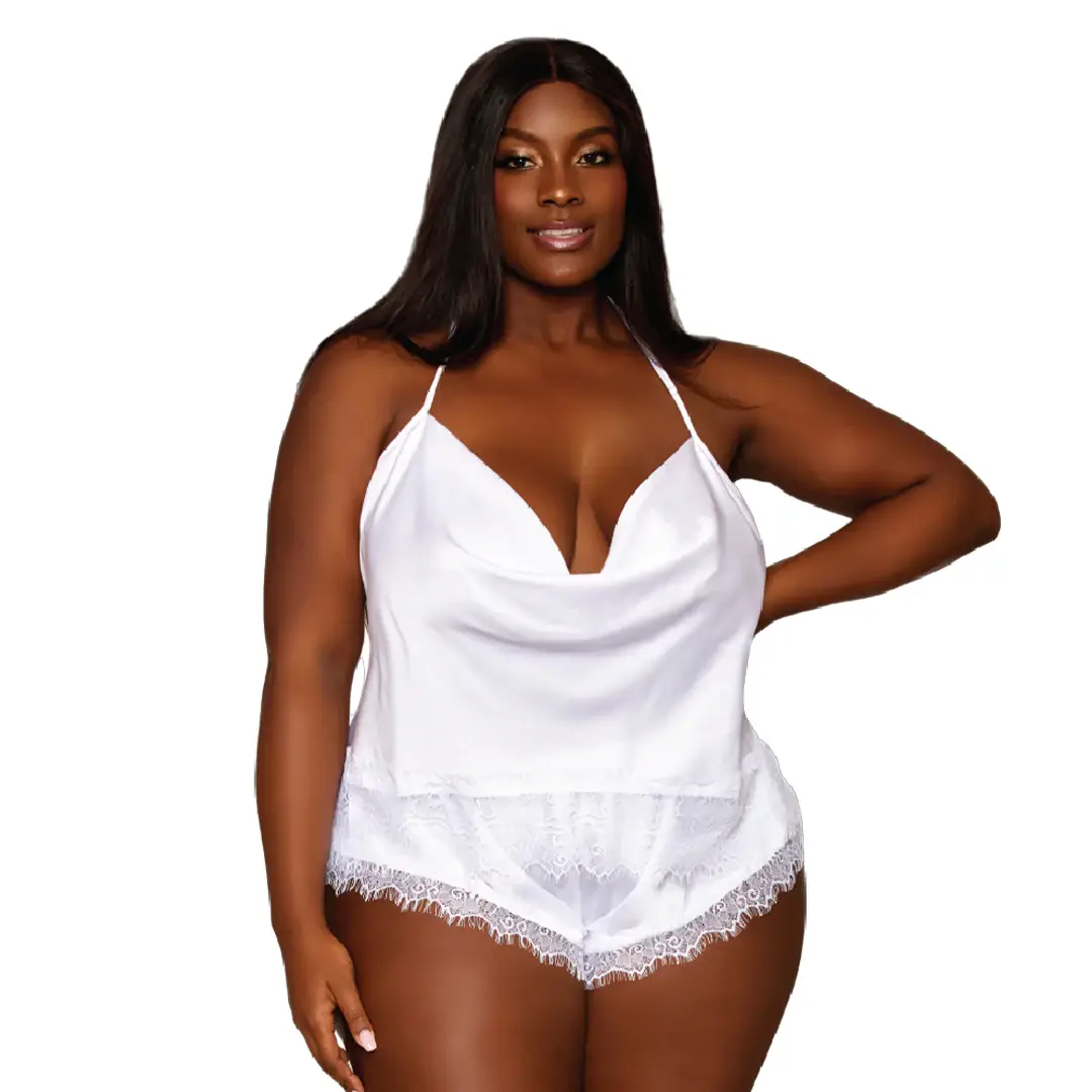 Wild at Heart Diamond is a satin cami & shorts set. Shine bright like a diamond with this matching cami and shorts set. Our exclusive new color, diamond, paired with an alluring open back and sheer lace make this set as sexy as it is comfortable. Slip it on and dazzle like the gem you are. Comes in sizes S, M, L, 1X, 2X, 3X. Choose your size.